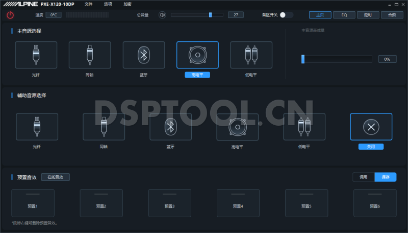此软件是阿尔派Alpine X120-10DP的专用电脑DSP调音软件,支持阿尔派型号为X120-10DP的DSP设备调音。